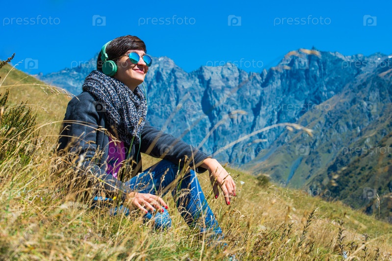 Молодая женщина слушает музыку в горах