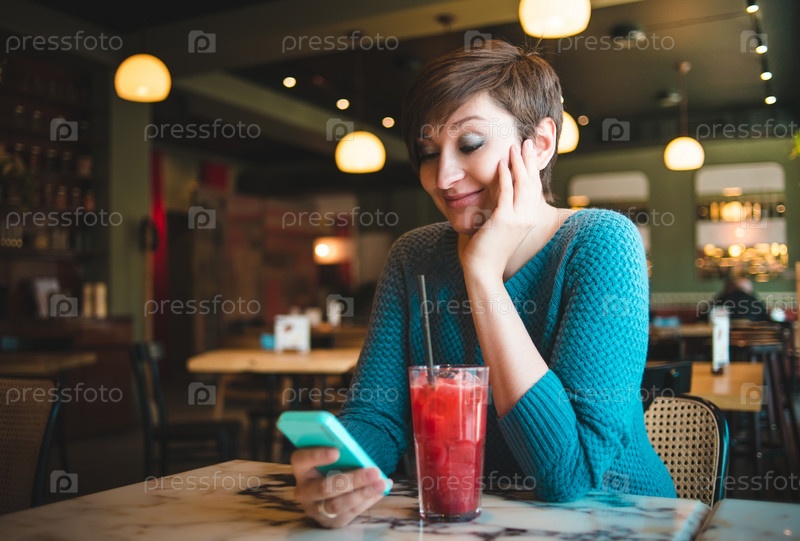 Девушка со смартфоном в кафе