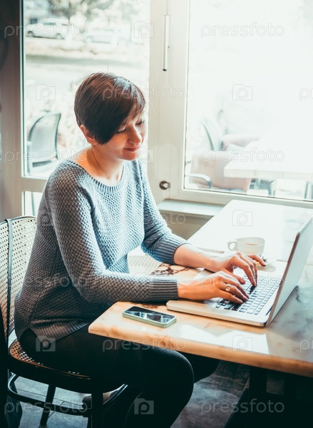 Девушка с ноутбуком в кафе