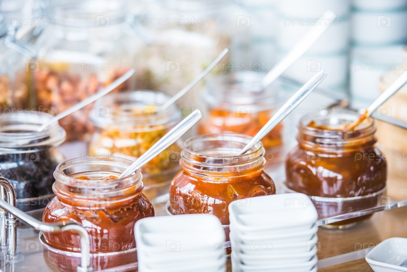 Банки с соусами, сухофруктами и орехами