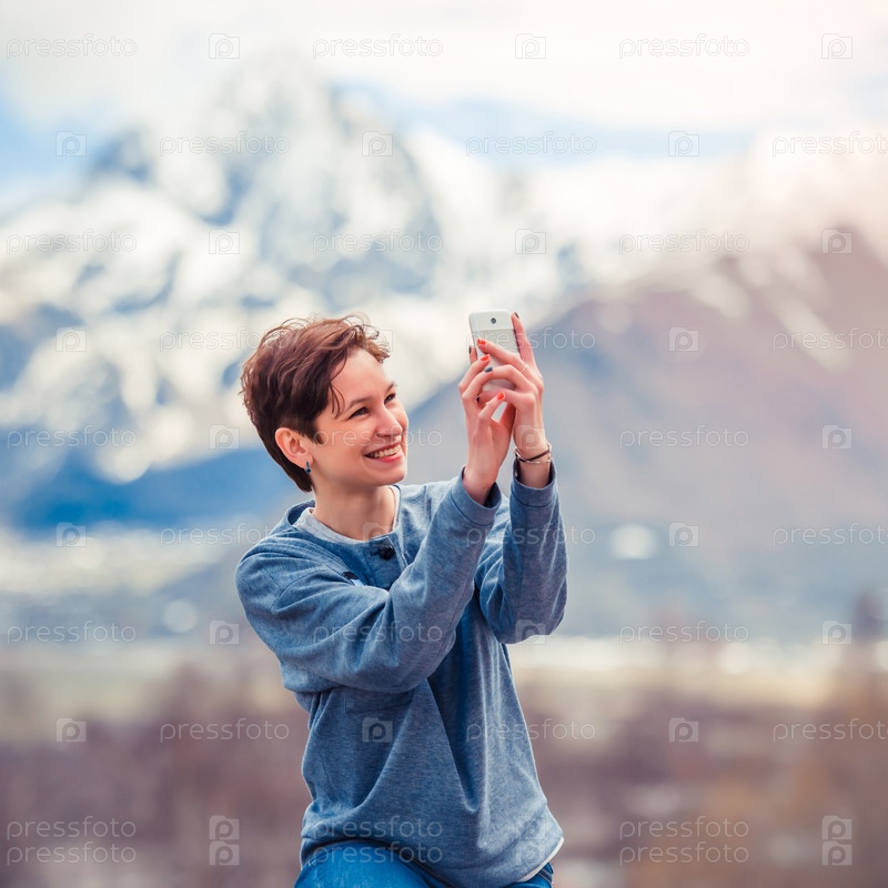 Девушка со смартфоном в горах