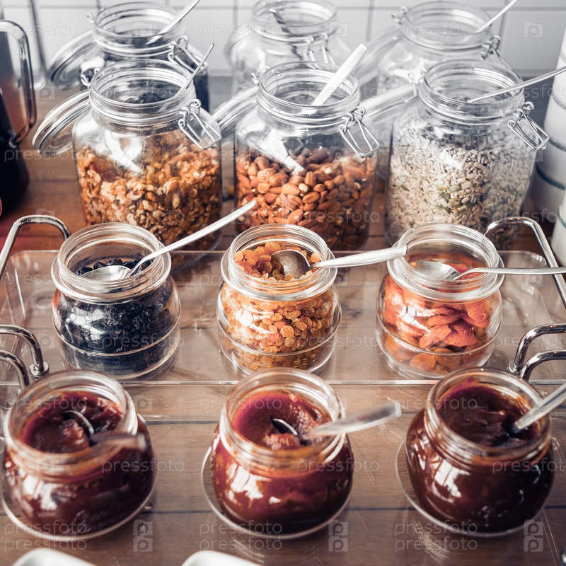 Банки с соусами, сухофруктами и орехами