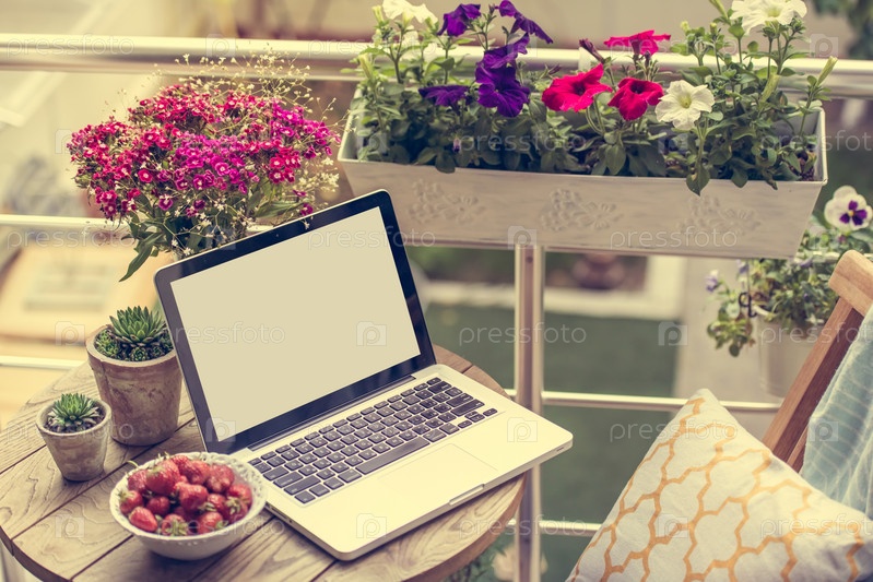 Ноутбук, клубника и цветы