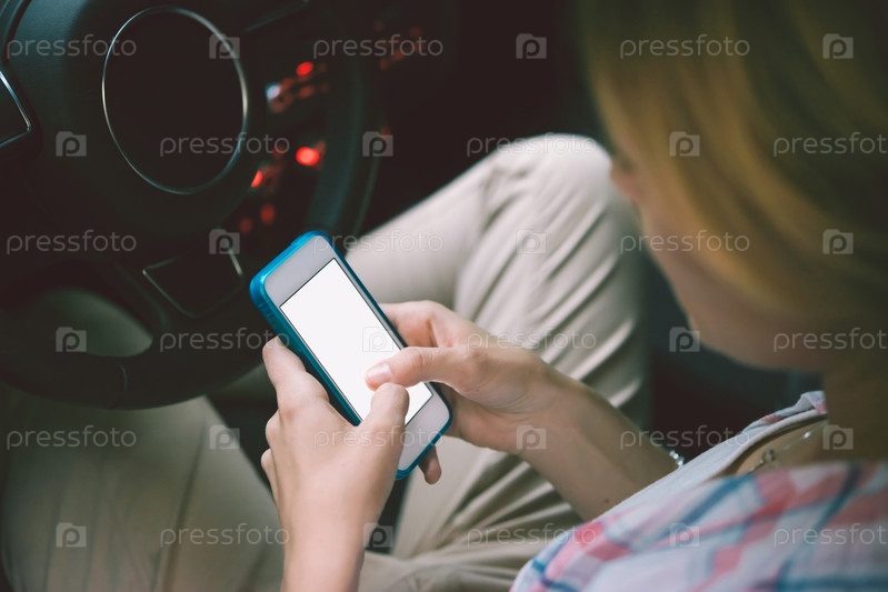 Девушка со смартфоном в руках за рулем