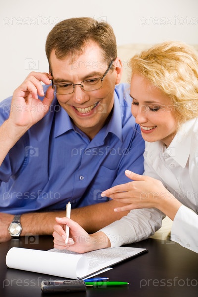 Фото молодой женщины и улыбающегося мужчины, обсуждающих рабочий проект на встрече