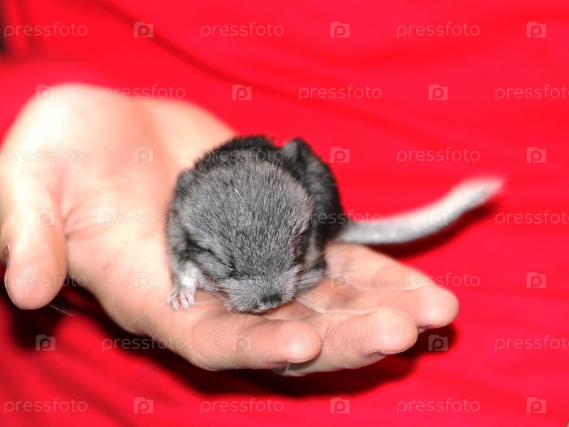 Детеныш шиншиллы на руке на красном фоне
