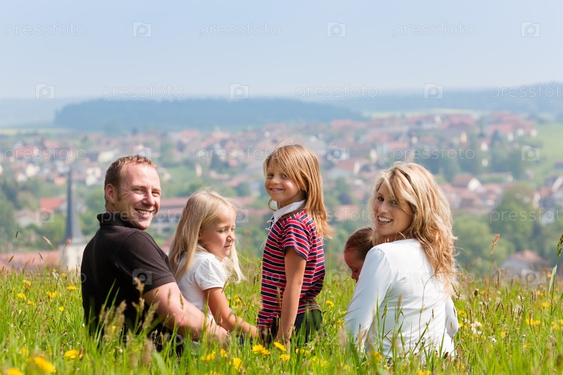 Молодая семья, сидящая на зеленой траве