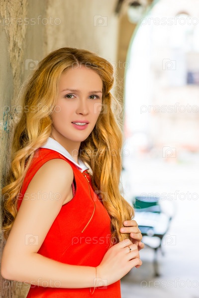 Красивая молодая девушка, касаясь ее белые кудри