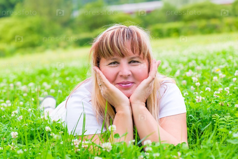 Красивая зрелая женщина, лежа на лугу и улыбается