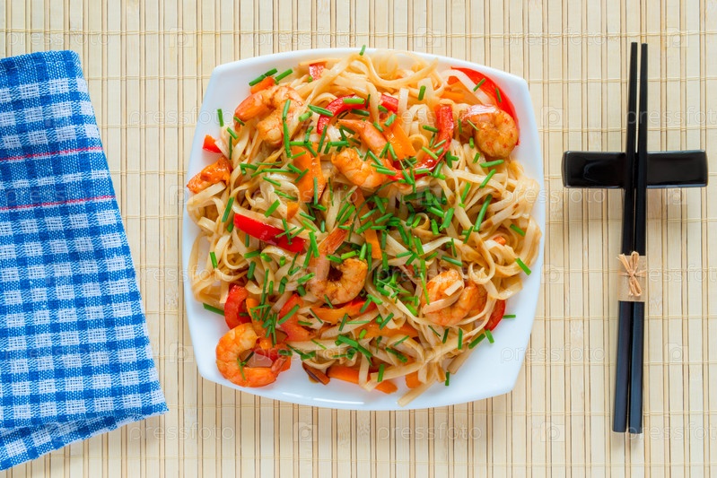 Вид сверху тарелку макарон и креветки
