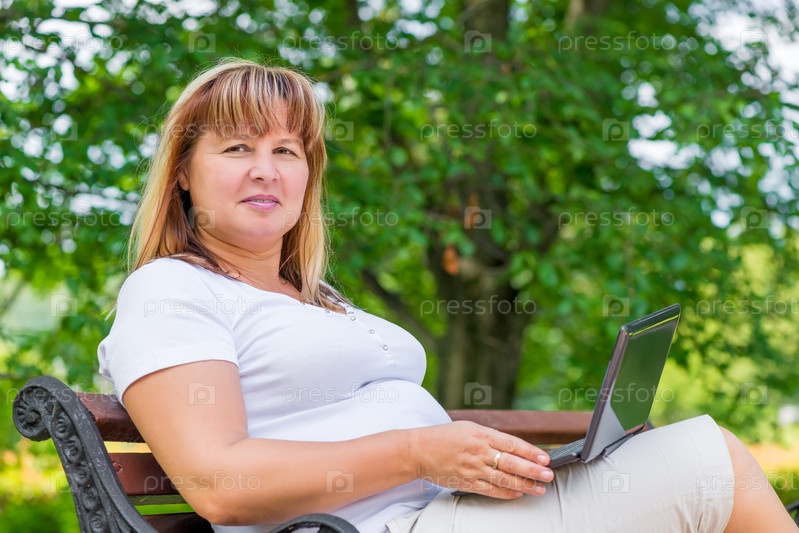 Портрет женщины на скамейке в парке с ноутбуком