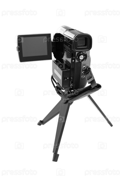 Видеокамера на штативе. Близкий план. Изолированный на белом фоне