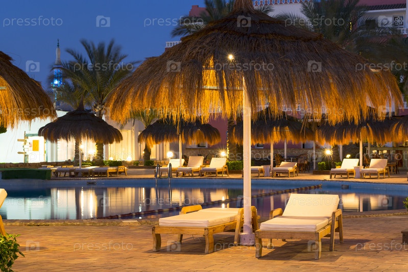 Соломенные зонтики и шезлонги у бассейна в Шарм-эль-Шейх