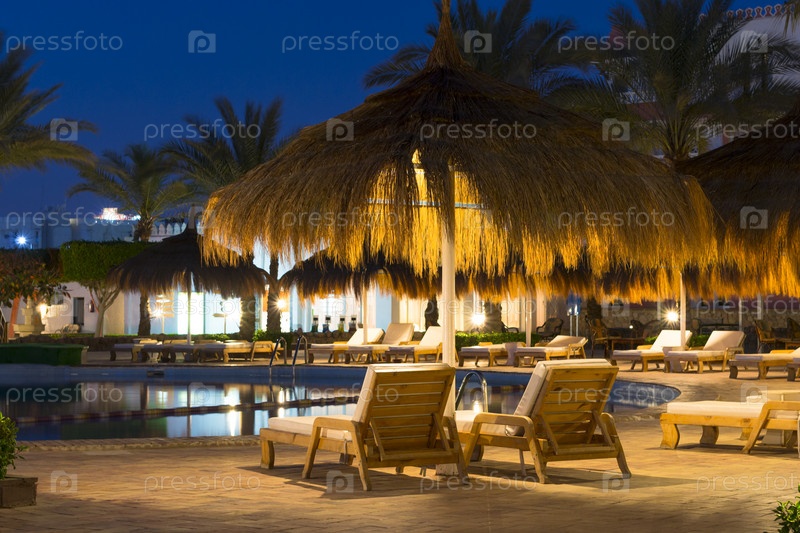 Соломенные зонтики и шезлонги у бассейна в Шарм-эль-Шейх