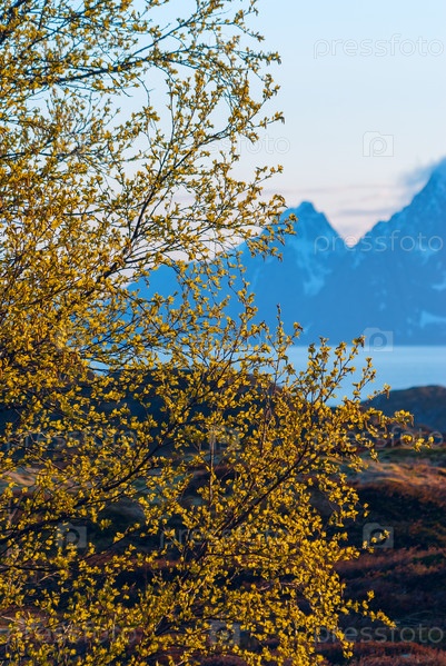 Зеленый куст на фоне заснеженных гор