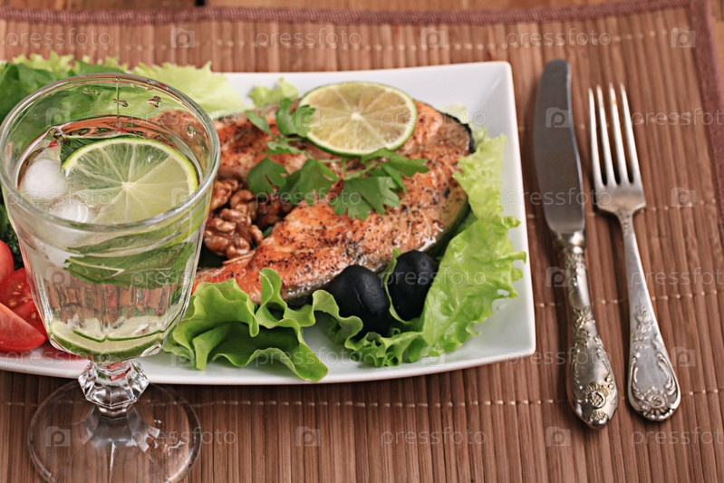 Лосось на гриле с салатом и орехами