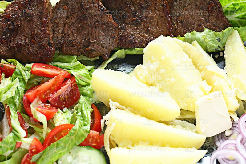 На гриле мяса на тарелку подается с овощами