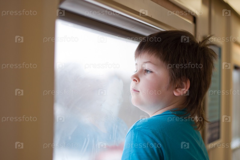 Мальчик смотрит в окно из купе пассажирского поезда