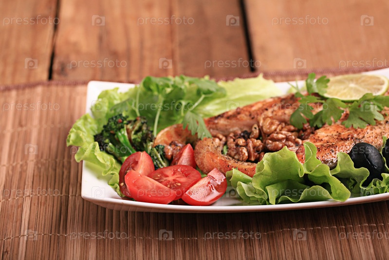 Лосось на гриле с салатом и орехами