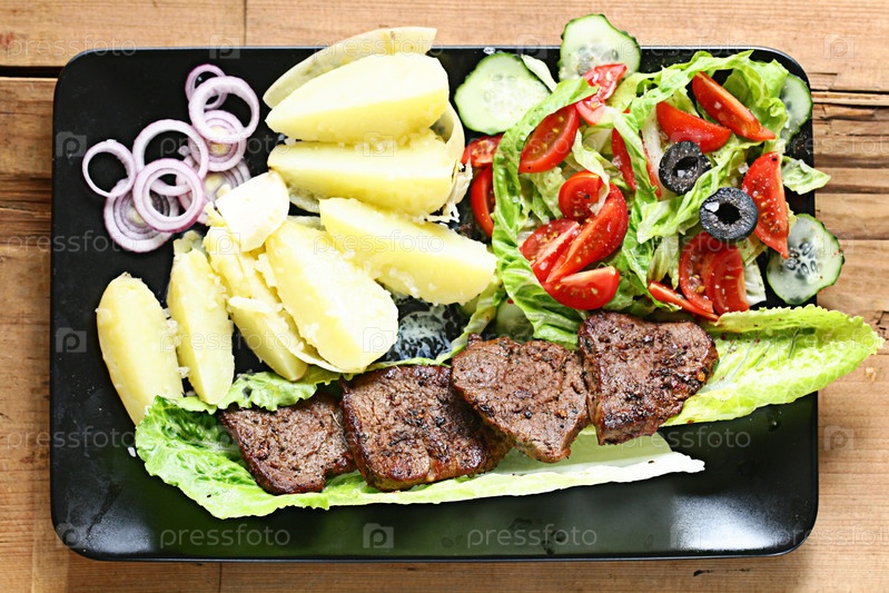 На гриле мяса на тарелку подается с овощами