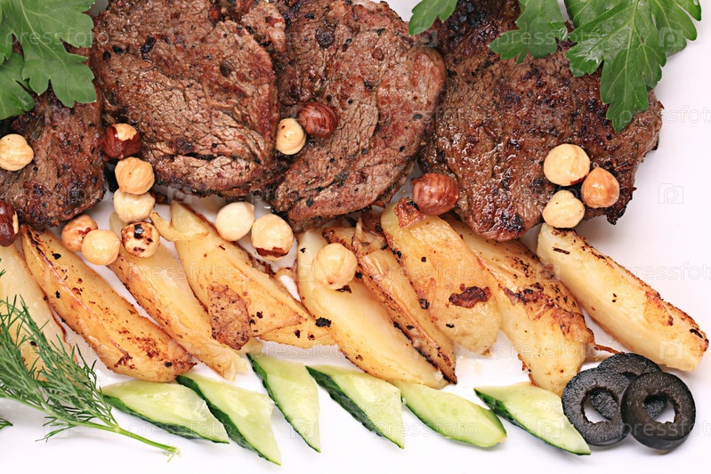 На гриле мяса на тарелку подается с овощами