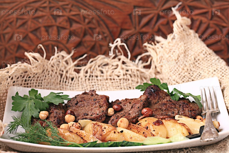 На гриле мяса на тарелку подается с овощами