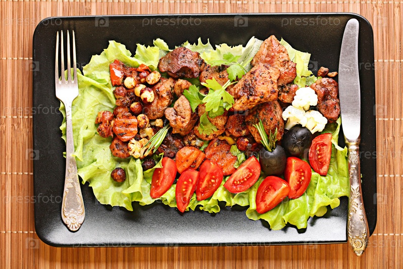 На гриле мяса на тарелку подается с овощами