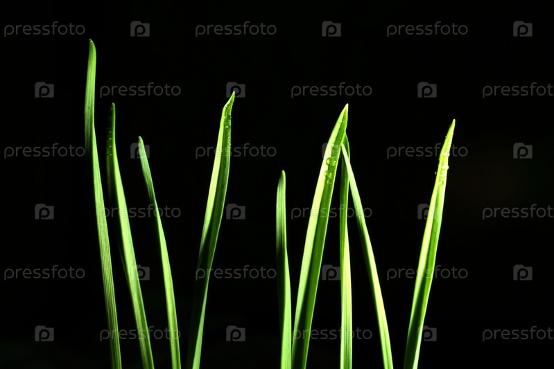 Зеленые побеги, ростки, трава, на черном фоне
