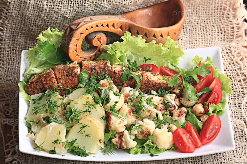 Лосось на гриле с салатом и орехами