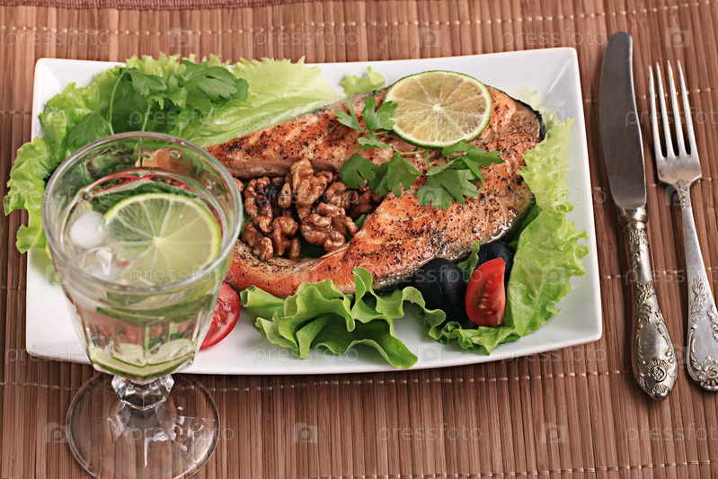 Лосось на гриле с салатом и орехами