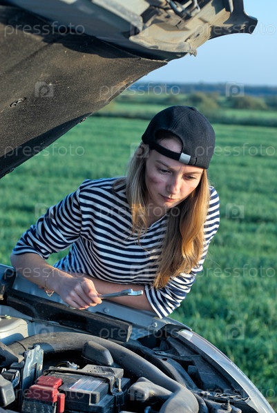 Молодая блондинка ремонтирует автомобиль