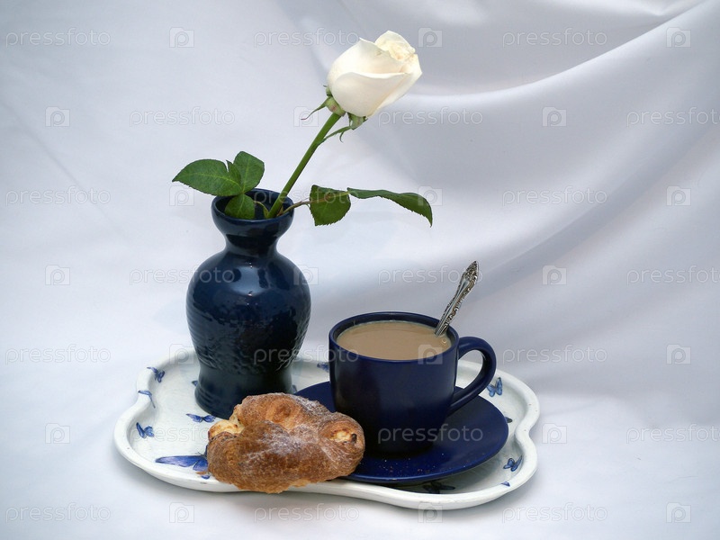 Беая роза, кофе и булочка на подносе