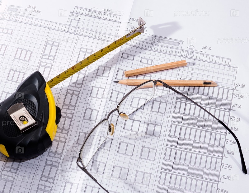 Рулетка, сломанный карандаш, схема фасада здания