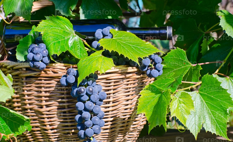 Корзина с виноградом и бутылка