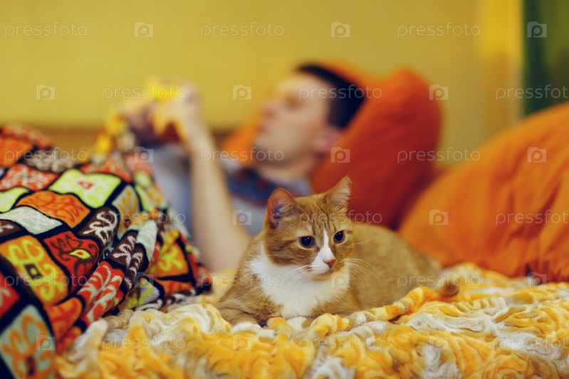 Рыжая кошка на кровати с мужчиной