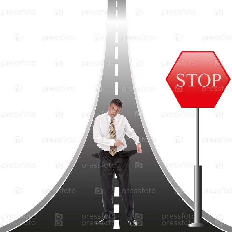 Деловой мужчина вывернул карманы на дороге перед знаком стоп, изолированно на белом фоне. Финансовое банкротство