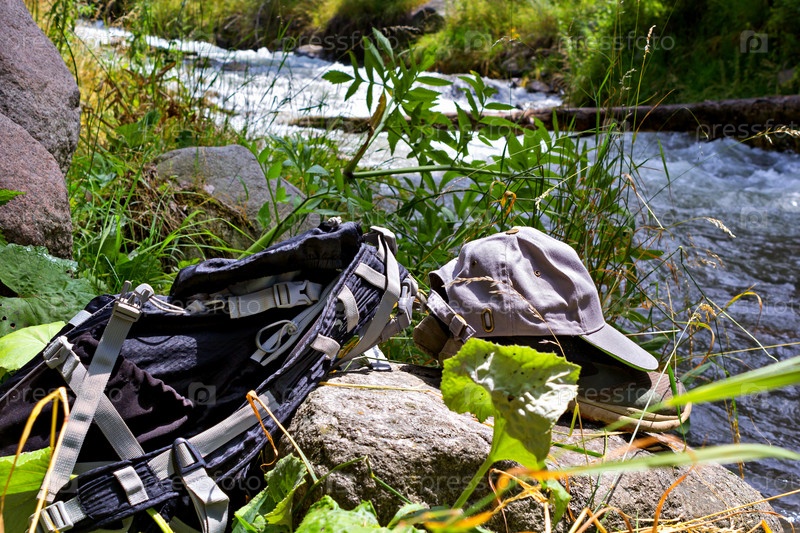 Рюкзак, кроссовки и кепка на берегу горной реки