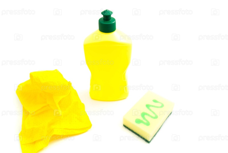 Губка, бутылка и тряпку на белом