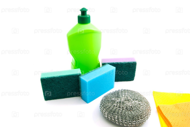 Зеленая бутылка, тряпки и губки