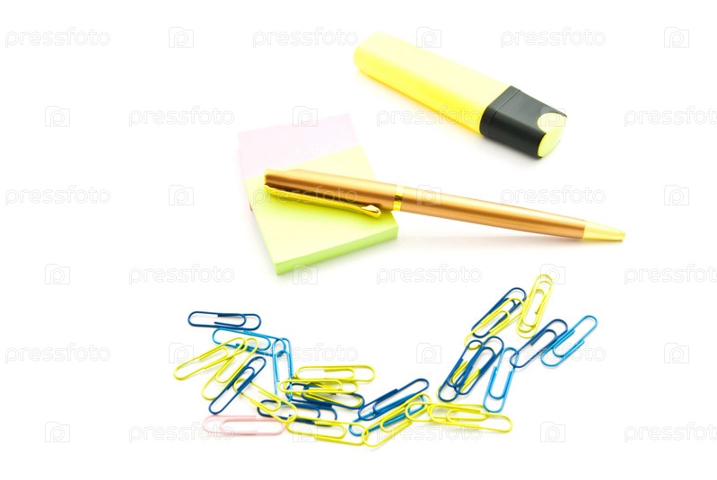 Наклейки, ручки, скрепки и маркер