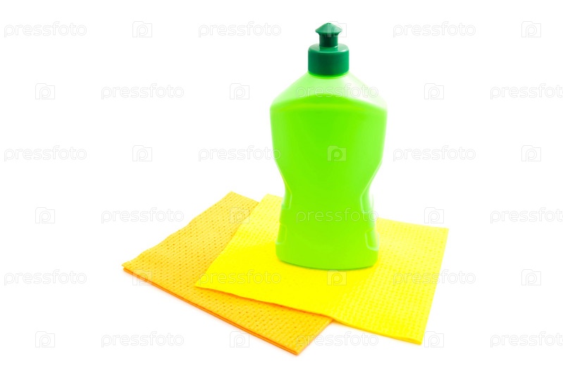 Зеленые бутылки моющего средства и тряпки