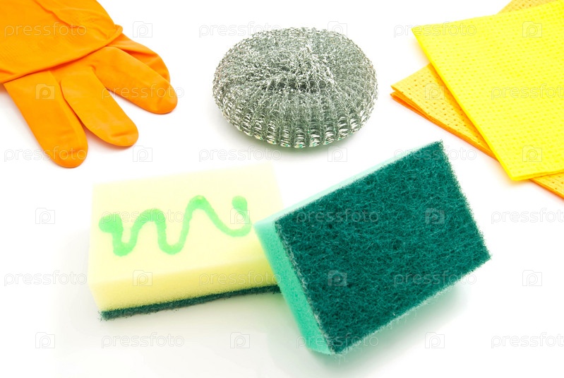Различные губки, тряпки и перчатки на белом