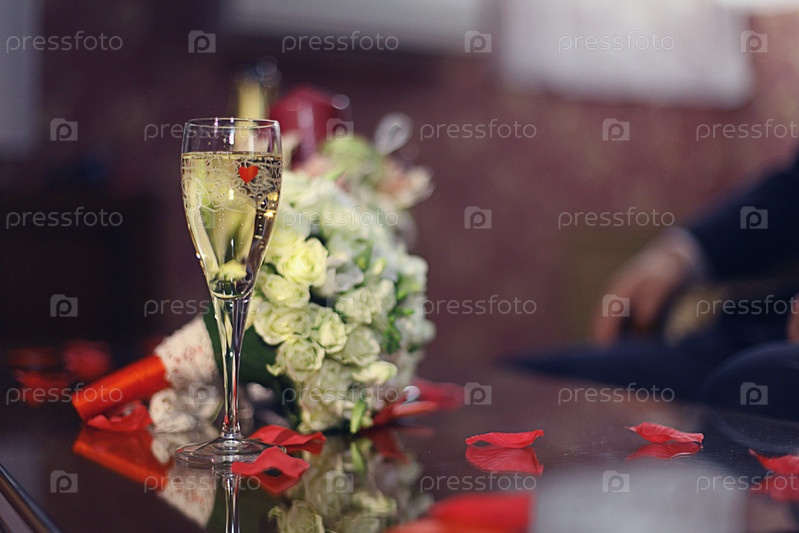 Шампанское и свадебный букет