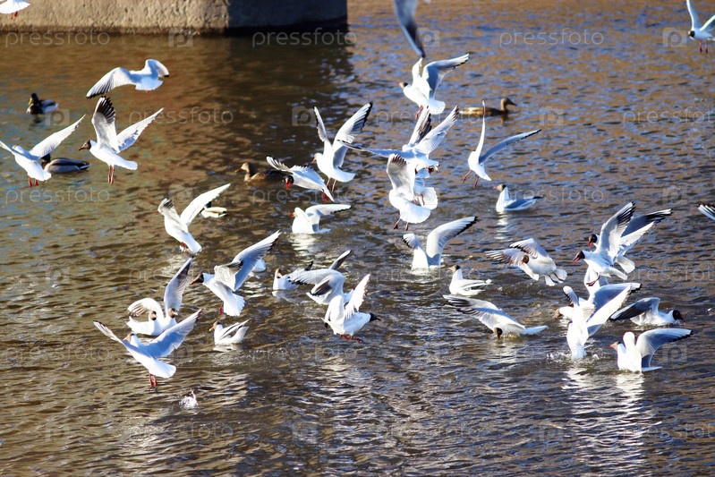 Стая чаек на реке