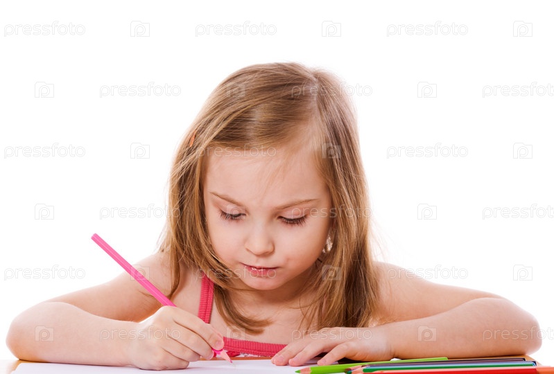 Маленькая девочка рисует за столом, изолированная на белом фоне