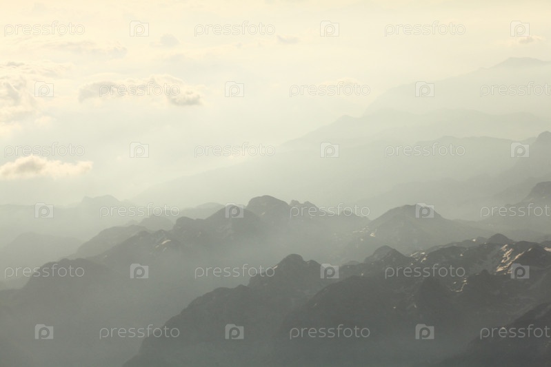 Горный пейзаж в тумане на горизонте