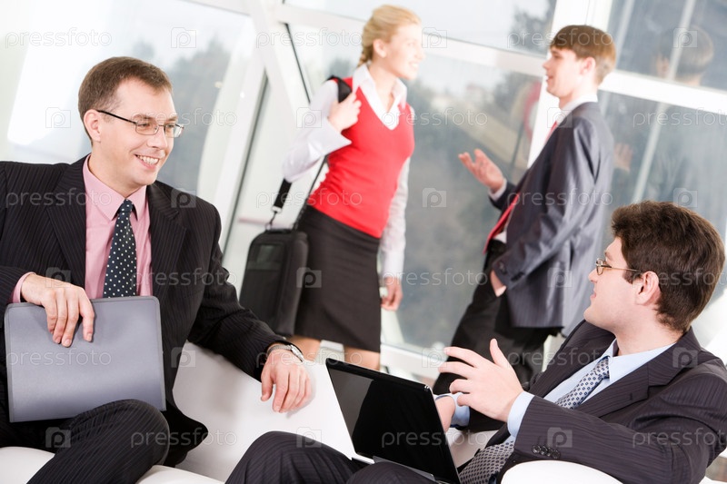 Портрет бизнесменов, ведущих переговоры друг с другом на фоне людей