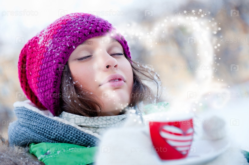 Девушка с кружкой на открытом воздухе зимой
