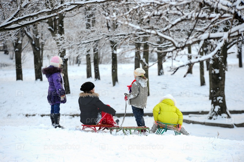 Дети катаются на санках в парке