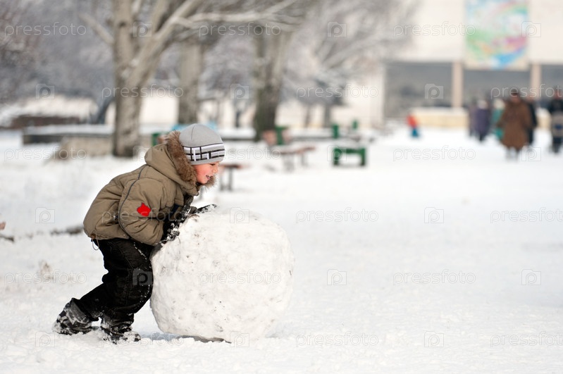 Радостный мальчик делает снеговика в парке